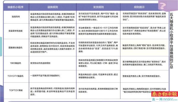 “我觉得太不合理了”,王女士向南都记者抱怨,她在使用抽盒机购买盲盒的过程中没有看到关于退款规则的相关提示,“如果提前知道了这些霸王条款,我一定不会买了。”