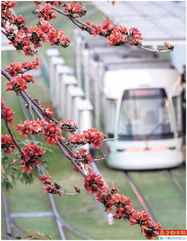 3月15日,广州阅江西路木棉花开正盛,有轨电车从树下驶过。 南都记者 徐杰 摄