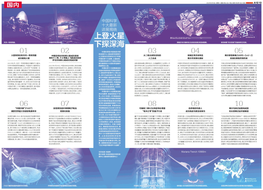 中国科学技术部高技术研究发展中心(基础研究管理中心)日前在北京发布2021年度中国科学十大进展,火星探测、中国空间站等10个项目从专业期刊推荐的310项科学进展中脱颖而出入