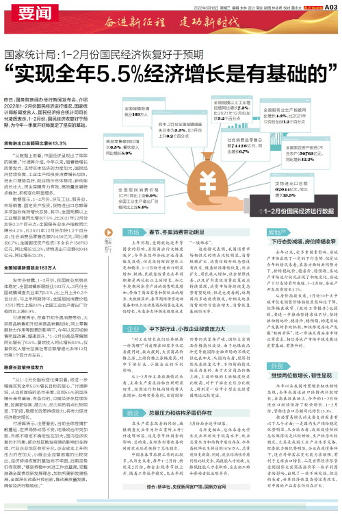 昨日,国务院新闻办举行新闻发布会,介绍2022年1-2月份国民经济运行情况。国家统计局新闻发言人、国民经济综合统计司司长付凌晖表示,1-2月份,国民经济恢复好于预期,为今年一季度开好局奠定了坚实的