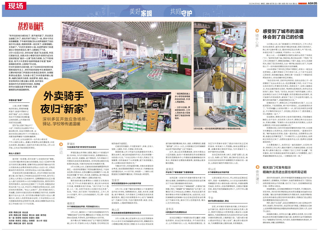 3月16日,福田区11个室内应急避难场所作为“暖蜂加油站”正式开放,覆盖全区10个街道,总计可容纳562名快递、外卖专员,且所有驿站24小时开放。