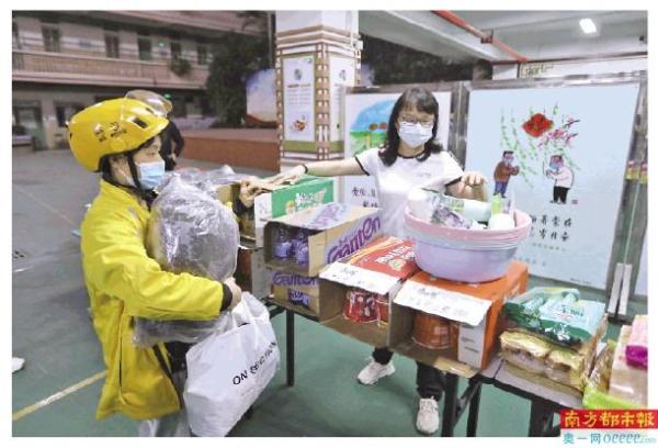 3月16日晚,罗湖翠茵学校,工作人员给外卖小哥准备好了食品饮料等物资。