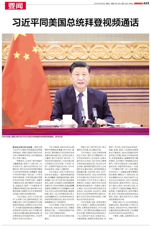 新华社北京3月18日电 国家主席习近平18日晚应约同美国总统拜登视频通话。两国元首就中美关系和乌克兰局势等共同关心的问题坦诚深入交换了意见。 拜登表示,50年前,美中两国作出重要抉择,发表了“上