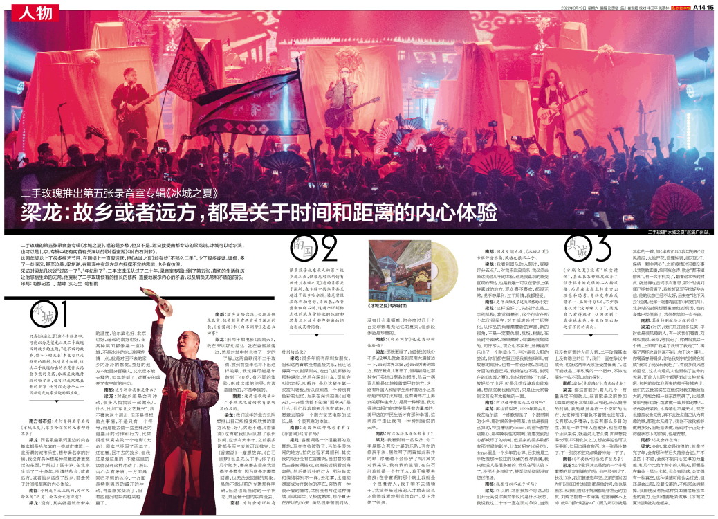 二手玫瑰的第五张录音室专辑《冰城之夏》,唱的是乡愁,但又不是。近日接受南都专访的梁龙说,冰城可以哈尔滨,也可以是北京,专辑中还有两首有关深圳的歌《香蜜湖》和《白石洲梦》。 这两年梁龙上了很多综艺