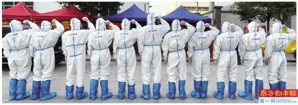 说实话,想着要近距离接近封控区人员,我们还是有些害怕。工作站的王医生给我们作了防疫培训,答疑解惑,让我们消除了心中顾虑。穿上防护服、戴好头套、口罩、面罩、手套、脚套等防护“六件套”,我们10名“城管蓝”瞬间化身“大白”。