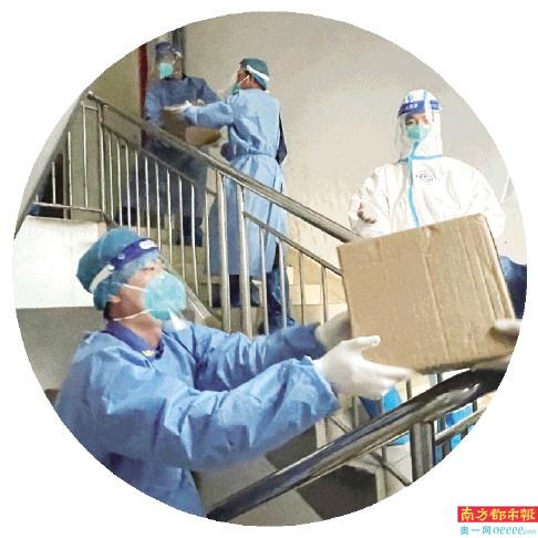 完成采样后稍作休息,就到了送午饭时间,我们当上了“外卖小哥”。这是一项体力活,我们两人一组,把一箱箱热乎乎的饭菜抬上楼,按照写好的房号分派给群众。这几天天气变热了,中午气温逐渐升高,伙伴们穿着密不透风的防护服,一趟上去已经汗流浃背,气喘吁吁。
