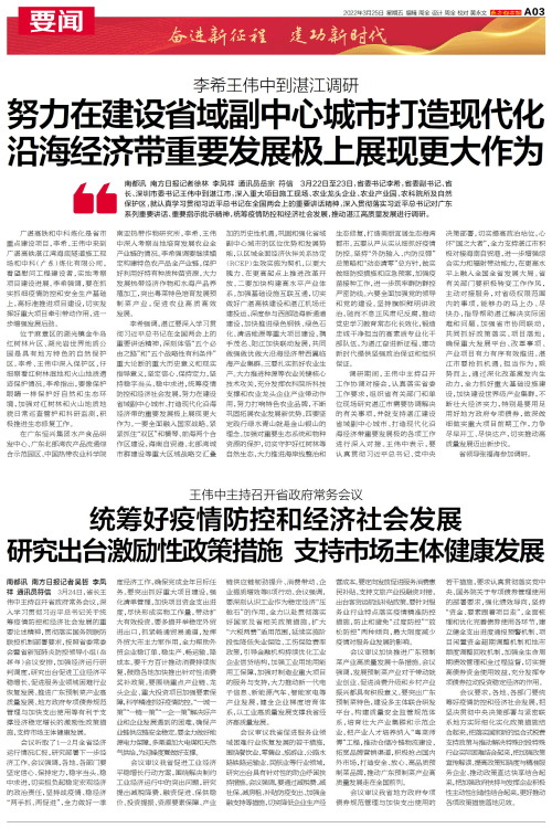 南都讯 南方日报记者徐林 李凤祥 通讯员岳宗 符信 3月22日至23日,省委书记李希,省委副书记、省长、深圳市委书记王伟中到湛江市,深入重大项目施工现场、农业龙头企业、农业产业园、农科院所及自然保