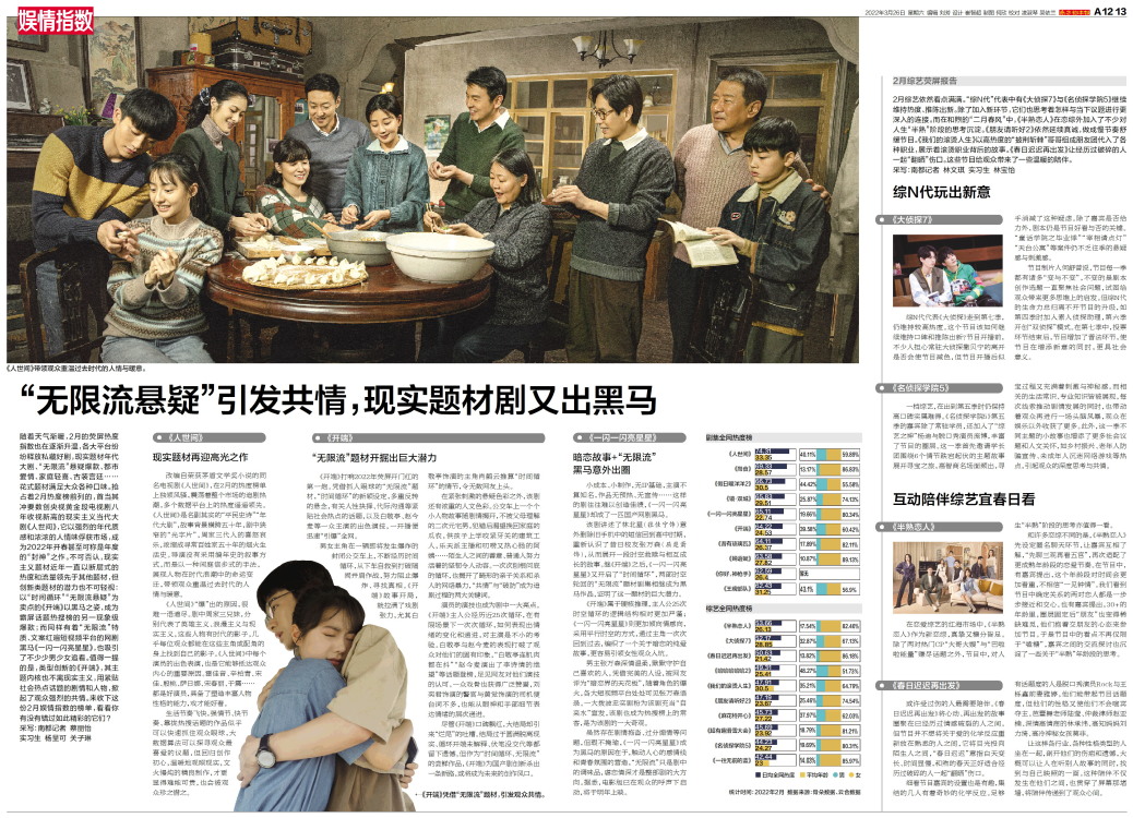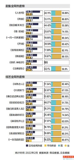 随着天气渐暖,2月的荧屏热度指数也在逐渐升温,各大平台纷纷释放私藏好剧,现实题材年代大剧、“无限流”悬疑爆款、都市爱情、家庭轻喜、古装宫廷……花式题材满足大众各种口味。抢占着2月热度榜前列的,首当其冲要数创央视黄金段电视剧八年收视新高的现实主义当代大剧《人世间》,它以强烈的年代质感和浓浓的人情味俘获市场,成为2022年开春甚至可称是年度的“封神”之作。不可否认,现实主义题材近年一直以断层式的热度和流量领先于其他题材,但创新类题材的潜力也不可轻视:以“时间循环”“无限流悬疑”为卖点的《开端》以黑马之姿,成为霸屏话题热搜榜的另一现象级爆款;而同样有着“无限流”特质、文案红遍短视频平台的网剧黑马《一闪一闪亮星星》,也吸引了不少少男少女追看。值得一提的是,类型创新的《开端》,其主题内核也不离现实主义,用紧贴社会热点话题的剧情和人物,掀起了观众强烈的共情。来收下这份2月娱情指数的榜单,看看你有没有错过如此精彩的它们?