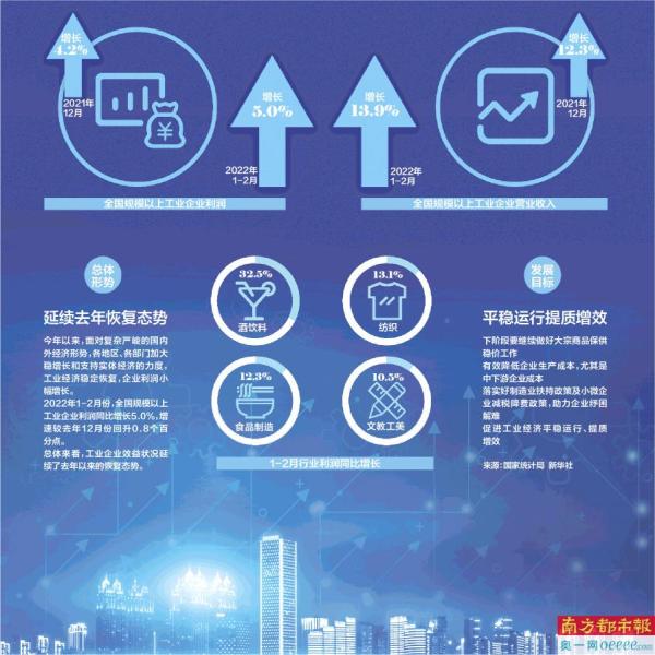 2022年1-2月份,全国规模以上工业企业利润同比增长5.0%,增速较去年12月份回升0.8个百分点。