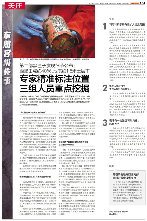 27日9时20分许,“3·21”东航航班飞行事故客机第二部黑匣子被找到了。此前23日发现了第一部黑匣子。至此,失事飞机两部黑匣子均已找到。当天16时20分,“3·21”东航MU5735航空器飞行事