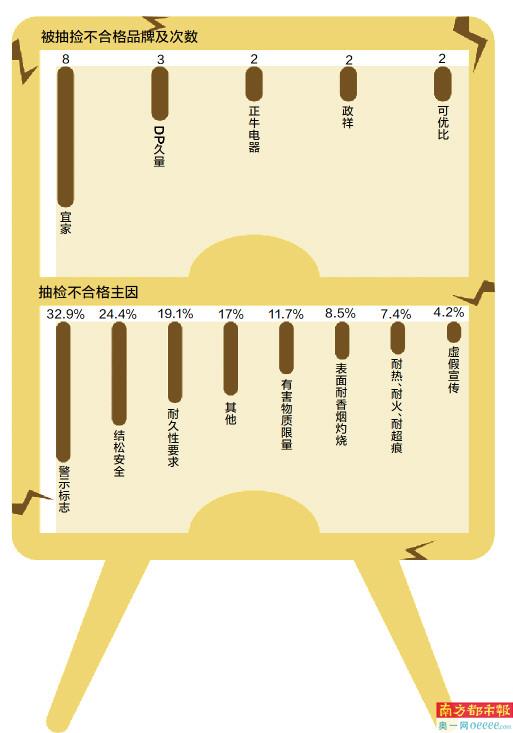 数据显示,家居品牌产品不达标的原因中,排行前三位分别是警示标识、结构安全以及耐久性要求,占比分别是32.9%、24.4%和19.1%。同时南都记者也注意到,部分品牌存在某批次产品多个项目检测都不合格的情况,例如DP久量的LED时尚折叠台灯、正牛电器的LED折叠台灯、晨光文具的LED暖白光触控护眼台灯就曾被海南省市监局抽检出两个项目不合格。