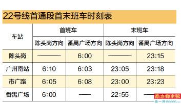22号线首通段西起陈头岗,东至番禺广场,全长18.2公里,共设4座车站,均为地下站。线路从陈头岗出发,途经广州南站、市广路站、番禺广场站,其中广州南站(换乘2号线、7号线、佛山地铁2号线)、番禺广场站(换乘3号线、18号线)为换乘站,乘客可按照换乘导向指引进行换乘。开通初期,22号线首通段运行最高速度为160公里/小时,单程用时约14分钟,行车间隔约7分30秒。