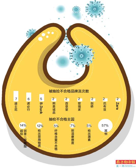 根据南都鉴定测评实验室2021年至2022年3月15日报道过的母婴行业全国及各省市市场监管局发布的抽检数据,综合天眼查数据内容,迪士尼共有7批次产品质量不合格而登上质量黑榜,被检出不合格次数最多;诺必行共被检出不合格6批次,是检出不合格批次数量第二的品牌;B.Duck被检出不合格批次5批次,位列第三;百草堂、歌瑞家、剑桥、熙美诚品、巴布豆、Zara分别被检出不合格2批次。