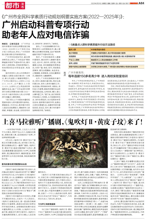 南都讯 记者冯芸清 《广州市全民科学素质行动规划纲要实施方案(2022—2025年)》(以下简称《实施方案》)日前出台。昨日,广州市政府就《实施方案》召开新闻发布会。 广州市科协党组书记、副主席