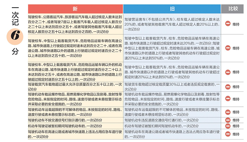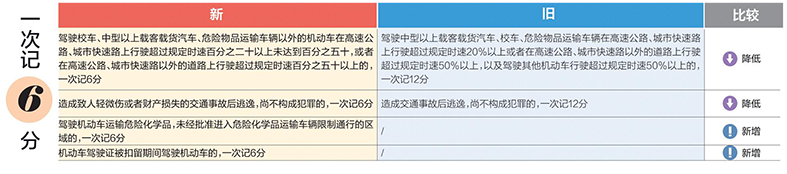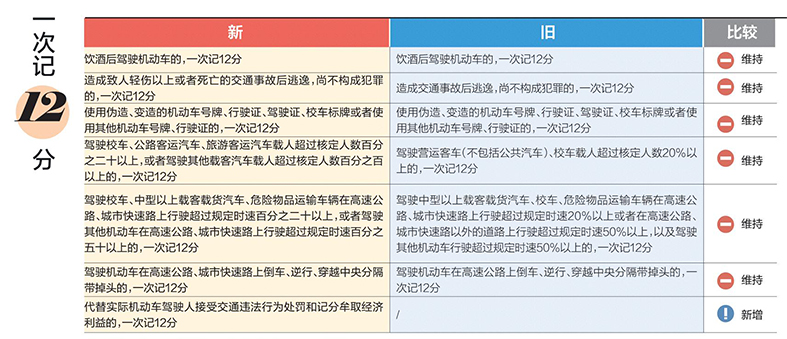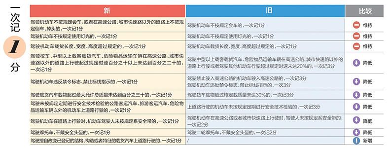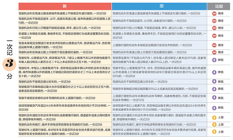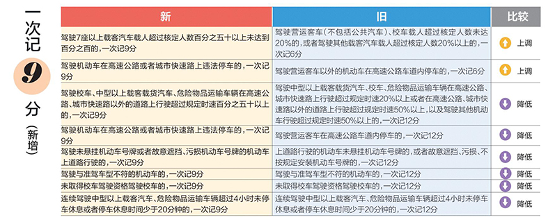 调整后一次记12分的记分行为由11项减少为7项,新增一次记9分的记分行为7项,一次记6分的记分行为由14项减少为11项,一次记3分的记分行为由12项增加为15项,一次记1分的记分行为由4项增加为10项。