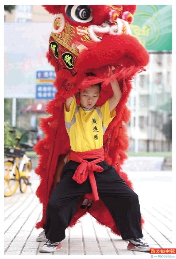黄釨敬用儿童醒狮道具“关公狮”表演。