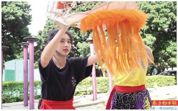 表演结束后,梁家荣揭下醒狮狮头,我们这才看到了活灵活现狮子的“幕后导演”。这位80后青年不仅是上川黄连胜醒狮舞传承人,也是醒狮武术团的总教练。