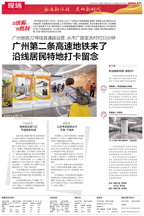 “终于等到它开通了,好开心。”昨日早上6点,广州地铁22号线首通段(番禺广场至陈头岗)首班车正式开通运营,沿线居民纷纷抢先登上22号线体验广州第二条高速地铁。无论车厢还是车站内,只见乘客们打卡拍照