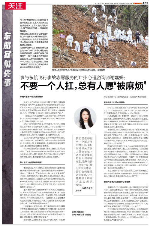 “3·21”东航MU5735航空器飞行事故发生后,机上人员的亲友如何渡过难关,成为人们共同的牵念。除了有形的支持,心理援助同样重要。南都记者注意到,除了心理专业队伍,多个高校的心理学研究团队、心理