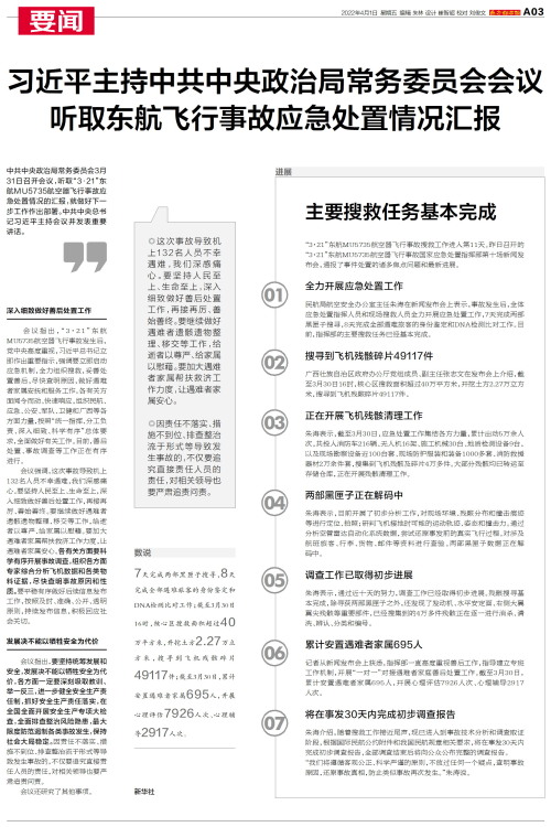 ◎这次事故导致机上132名人员不幸遇难,我们深感痛心。要坚持人民至上、生命至上,深入细致做好善后处置工作,再接再厉、善始善终。要继续做好遇难者遗骸遗物整理、移交等工作,给逝者以尊严、给家属以慰藉。