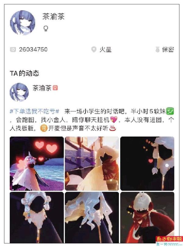 南都记者了解到,陪玩平台火爆下,女性陪玩比男性陪玩吃香。对女性陪玩要求“接触过游戏,技术无硬性要求,声音动听”,对男性陪玩的要求是“任一游戏水平需达到要求,如王者最强王者以上”,有些陪玩团更是标明“招陪玩,限女生”。在这样的市场需求导向下,部分男性陪玩为提升接单量,甚至伪装成女性陪玩,使用变声器软件的男性陪玩不少见。在个人简介里,“技术带飞”后往往会接“人皮话多”“可盐可甜”“撒娇能手”“可语音可视频”“可处CP”等与游戏毫无关系的形容词。