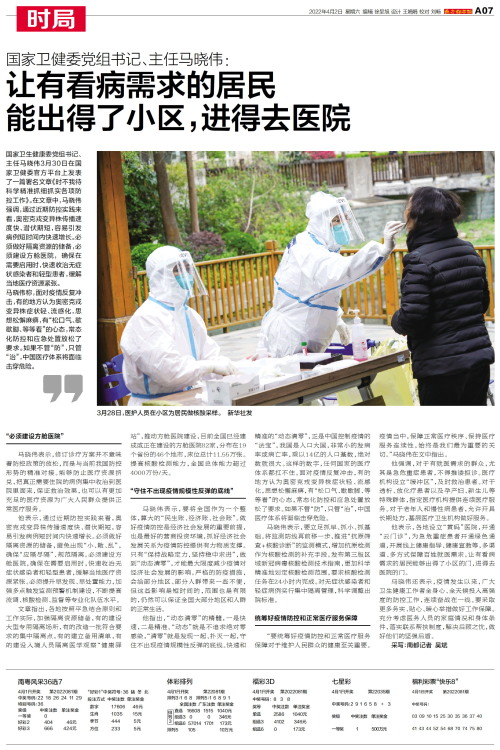 国家卫生健康委党组书记、主任马晓伟3月30日在国家卫健委官方平台上发表了一篇署名文章《时不我待科学精准抓细抓实各项防控工作》。在文章中,马晓伟强调,通过近期防控实践来看,奥密克戎变异株传播速度快、