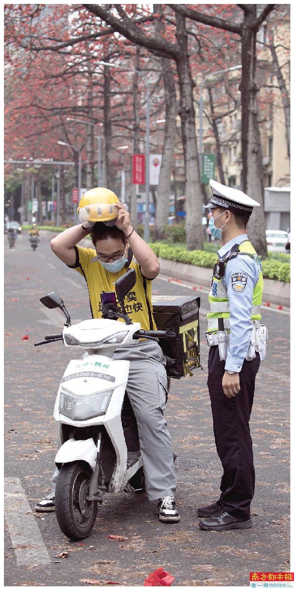 广州陵园西路,一位交警在劝说市民骑电动自行车要佩戴安全帽。 南都拍客 白洁 摄