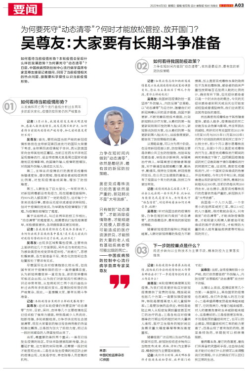 如何看待当前疫情形势?本轮疫情会呈现什么样的发展趋势?为何要死守“动态清零”?日前,中国疾病预防控制中心流行病学首席专家吴尊友接受记者提问,回答了当前疫情相关的热点问题,提醒要科学理性认识当前疫情