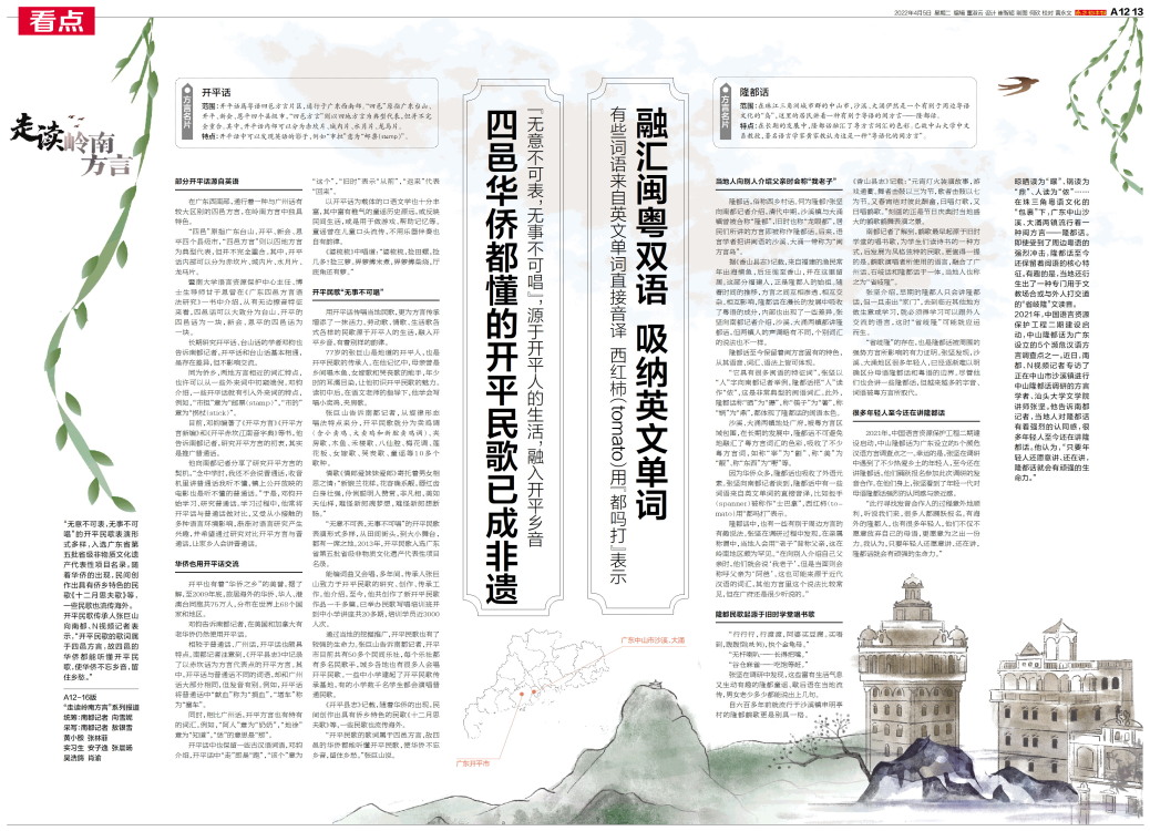 用开平话传唱当地民歌,更为方言传承增添了一抹活力。劳动歌、情歌、生活歌各式各样的民歌源于开平人的生活,融入开平乡音,有着别样的韵律。