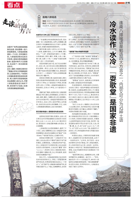 方言名片 连南八排瑶语 地域:坐落于广东清远市的连南瑶族自治县,是全国唯一的八排瑶聚居地。特点:八排瑶语没有对应的文字系统。受瑶汉语言接触的影响,瑶语中有不少汉语借词,也出现了一些汉语的语法形