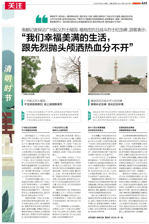 清明时节,悼念故人,瞻仰革命先烈,缅怀历史。日前,南都记者探访广州起义烈士陵园、植地庄抗日战斗烈士纪念碑,追寻历史的足迹,了解烈士们奋勇抗日的英雄事迹。有游客表示,每隔一两年便会到这里来瞻仰烈士,
