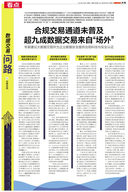 “2020年场内数据交易规模仅占总体交易市场规模的4%”“2021年我国数据黑市交易市场规模已超过1500亿元”?曾被“曝光”的这两个测算数据,或道出了目前数据场外交易活跃、场内交易冷清的现状。“