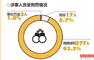 南都记者对上述128件案件中涉案的297人的刑罚情况进行分析,被判处有期徒刑、拘役、单处罚金的,分别为277人、17人、3人,占比分别为93.3%、5.7%、1.0%。而根据是否判处缓刑情况来看,有71人被判处缓刑。在罚款方面,被判处的罚款金额在1000元到80万元之间,其中有17个人罚款金额在10万元以上。