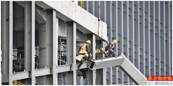 建筑工人在广东省“三馆合一”项目作业。 南都拍客 关利生 摄