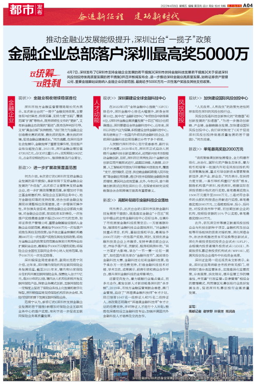 4月7日,深圳发布了《深圳市支持金融企业发展的若干措施》《深圳市扶持金融科技发展若干措施》《关于促进深圳风投创投持续高质量发展的若干措施》并召开新闻发布会,进一步推动深圳金融业高质量发展。如将证券