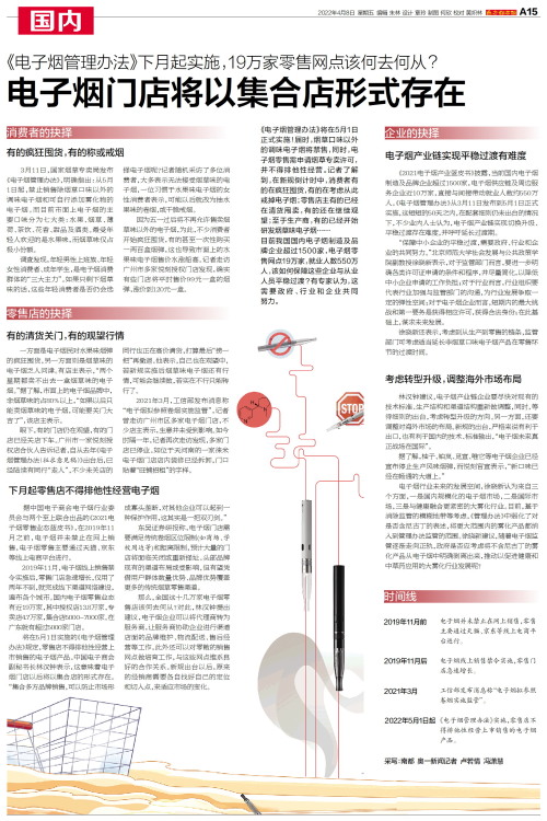 《电子烟管理办法》将在5月1日正式实施!届时,烟草口味以外的调味电子烟将禁售,同时,电子烟零售需申请烟草专卖许可,并不得排他性经营。记者了解到,在新规倒计时中,消费者有的在疯狂囤货,有的在考虑从此