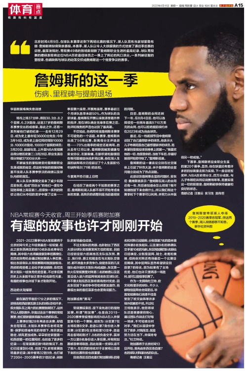 不仅如此,伤病同样是詹姆斯本赛季不可避免的一个话题。本赛季,詹姆斯共出战了56场比赛,距离得分王评选资格——70%出勤率的规定还差两场。自从去年12月以来,詹姆斯因触发健康与安全协议、左膝酸痛、左膝积液和脚踝扭伤等问题被迫休战多场比赛。他在湖人生涯的缺阵场次已经超过了个人生涯前15年缺阵场次(71场)的总和。