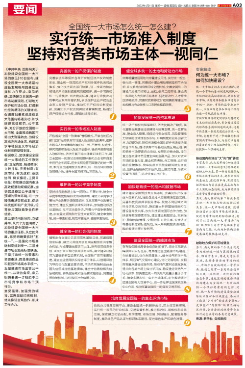 《中共中央 国务院关于加快建设全国统一大市场的意见》10日发布。建设全国统一大市场是构建新发展格局的基础支撑和内在要求。意见明确,加快建立全国统一的市场制度规则,打破地方保护和市场分割,打通制约经