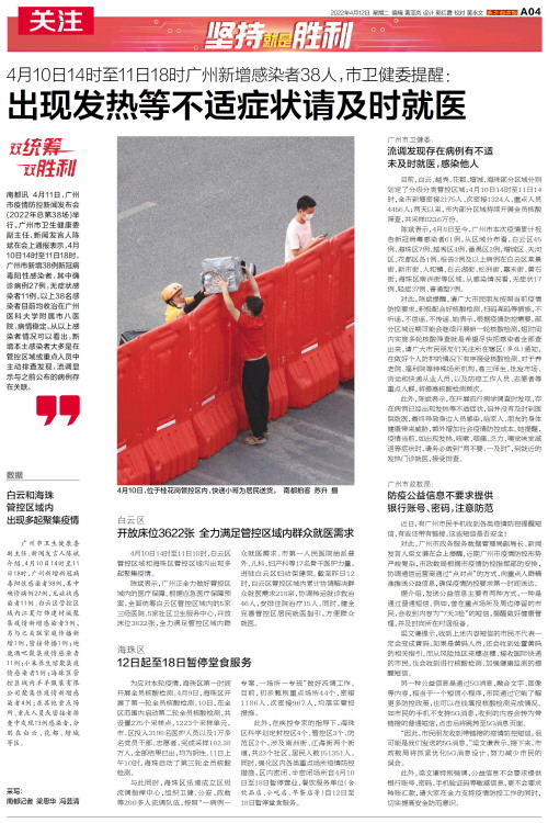 南都讯 4月11日,广州市疫情防控新闻发布会(2022年总第38场)举行。广州市卫生健康委副主任、新闻发言人陈斌在会上通报表示,4月10日14时至11日18时,广州市新增38例新冠病毒阳性感染者,