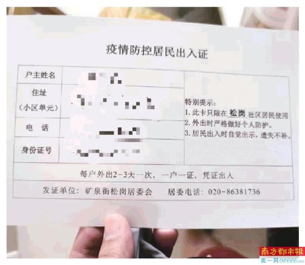3. 4. 越秀区矿泉街的住户向南都记者展示出入证,凭证每户一人每天2-3次可出门采购物资,还能点附近门店的奶茶外卖。