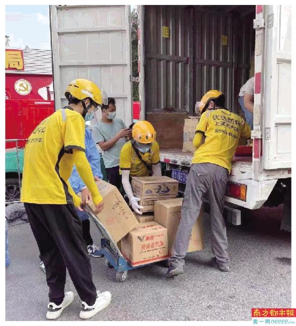 1. 外卖平台骑手志愿者在帮社区搬运物资。