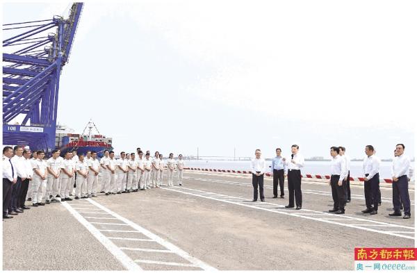 12日上午,习近平在洋浦国际集装箱码头小铲滩港区,同现场作业人员、挂职干部代表等亲切交流。