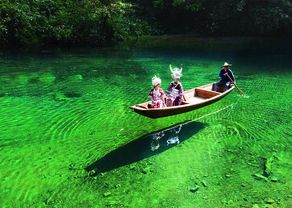 游人在屏山村屏山旅游景区体验悬浮船。湖北省恩施土家族苗族自治州鹤峰县容美镇屏山村屏山旅游景区河水清澈见底,舟行水上如悬浮空中,美如画卷。 新华社发