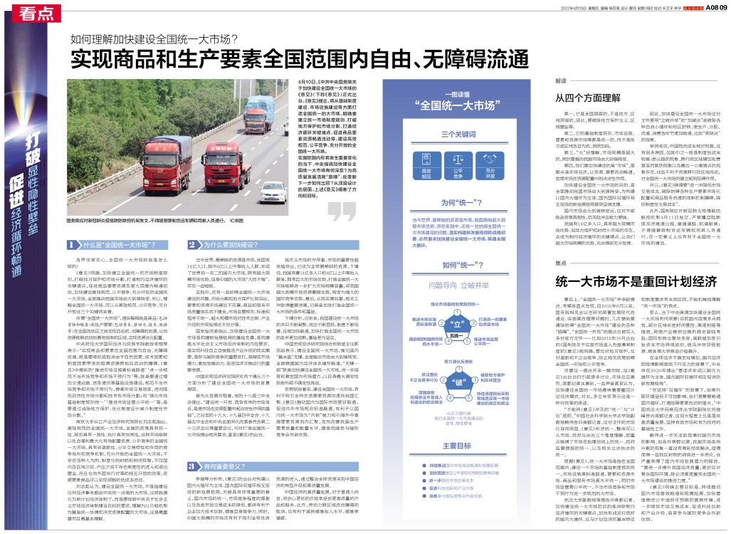 4月10日,《中共中央国务院关于加快建设全国统一大市场的《意见》(下称《意见》)正式出台。《意见》提出,将从基础制度建设、市场设施建设等方面打造全国统一的大市场。明确要建立统一市场制度规则、打破地