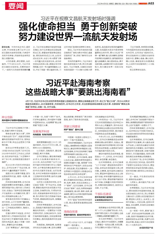 新华社电 中共中央总书记、国家主席、中央军委主席习近平12日到文昌航天发射场视察,代表党中央和中央军委,向发射场全体同志致以诚挚问候。 4月的海南,满目青翠,生机盎然。下午3时30分许,习近平来