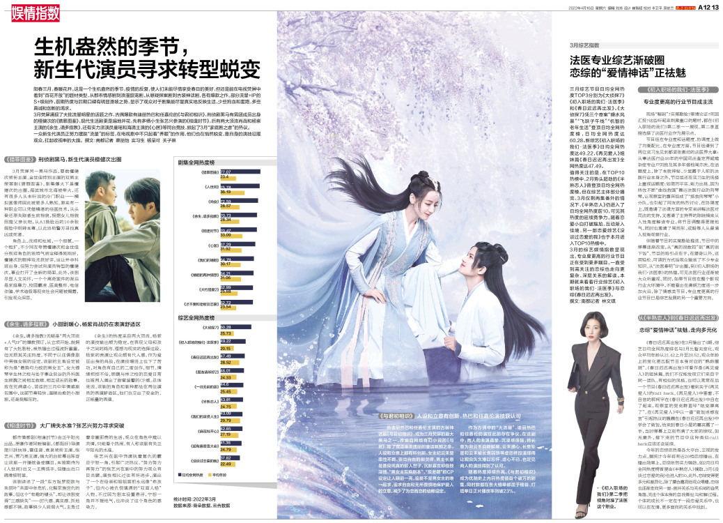 3月的综艺娱情指数显现出,专业度更高的行业节目正在受到更多瞩目。一直受到高关注的恋综也走向更复杂、深层关系的解读。本期就来看看行业综艺《初入职场的我们·法医季》与恋综《春日迟迟再出发》。