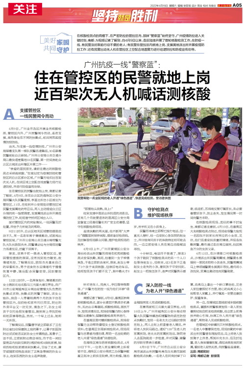 在核酸检测点的雨棚下,在严密防控的管控区内,那抹“警察蓝”始终坚守。广州疫情防控进入关键时刻,南都、N视频记者了解到,自4月9日以来,各区陆续开展了数轮核酸检测工作。在防疫一线,有民警及时救助行动