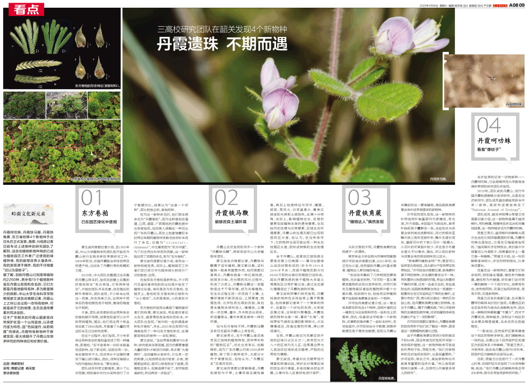 丹霞呵叻蛛、丹霞铁马鞭、丹霞铁角蕨、东方卷柏等4个新物种于近日先后正式发表。南都、N视频记者日前专访上述物种的研究团队了解到,这些动植物新物种有的已成为植物园艺工作者广泛使用的绿植种类、有的能够改