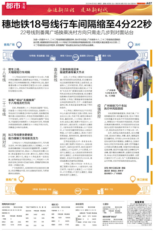 为进一步提升十八、二十二号线乘客的通勤效率,自4月16日起,广州地铁十八、二十二号线将启用新的运行图。根据新版列车运行图,十八号线工作日将增设早晚高峰时段,行车间隔大幅压缩至4分22秒;二十二号线