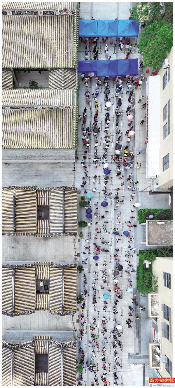 4月12日,越秀区开展新一轮核酸检测,市民在杨箕村祠堂核酸检测点排队进行检测。 南都拍客 张业斌 摄